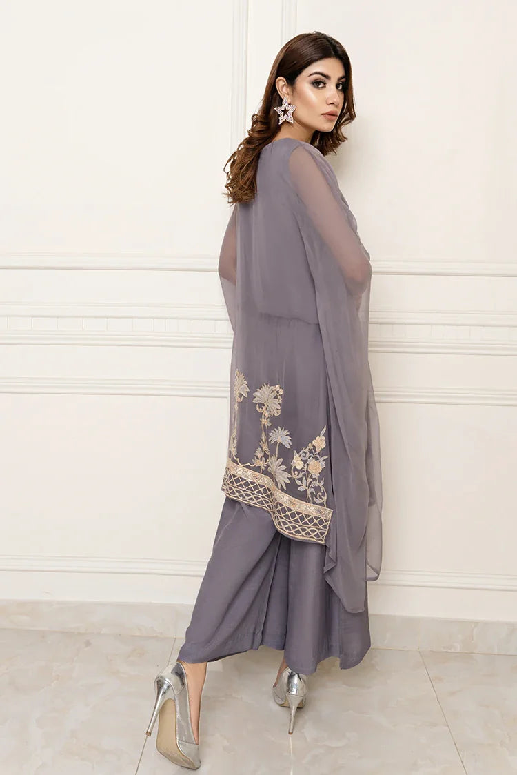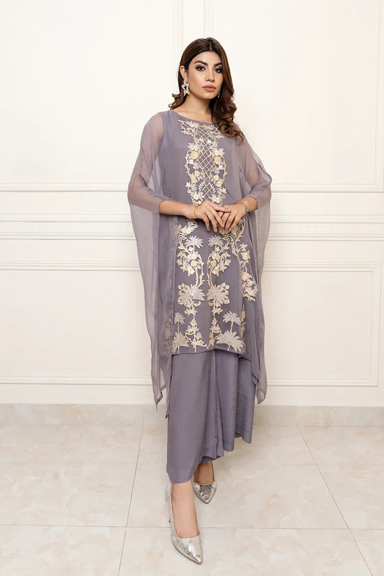This gray chiffon outfit is adorned with pastel shades of pinks and cream of lemon color.