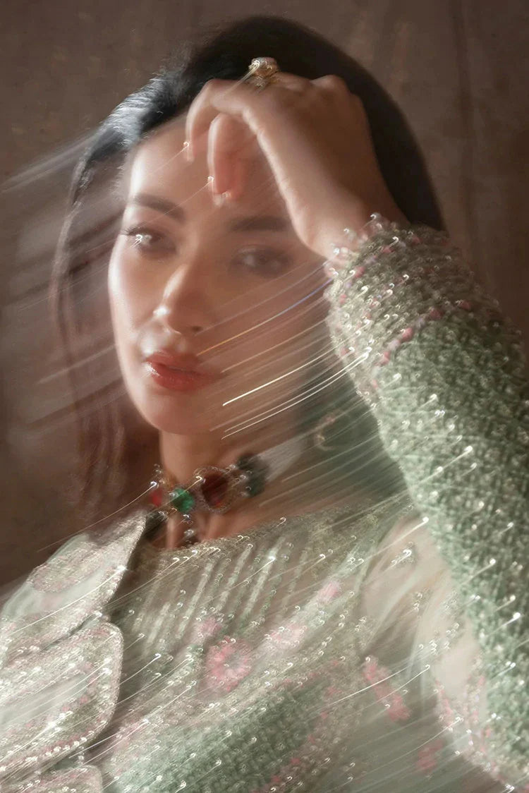 Glee Captures Soft Elegance In A Refreshing Pista Hue. The Ensemble Features An Embroidered Net Shirt With Delicate Sleeves And A Lace-Detailed Belt, Paired With Shimmering Tissue Trousers For A Refined Finish. An Embroidered Net Dupatta Adds A Graceful Touch, Making Glee A Perfect Choice For Festive Gatherings And Special Occasions.