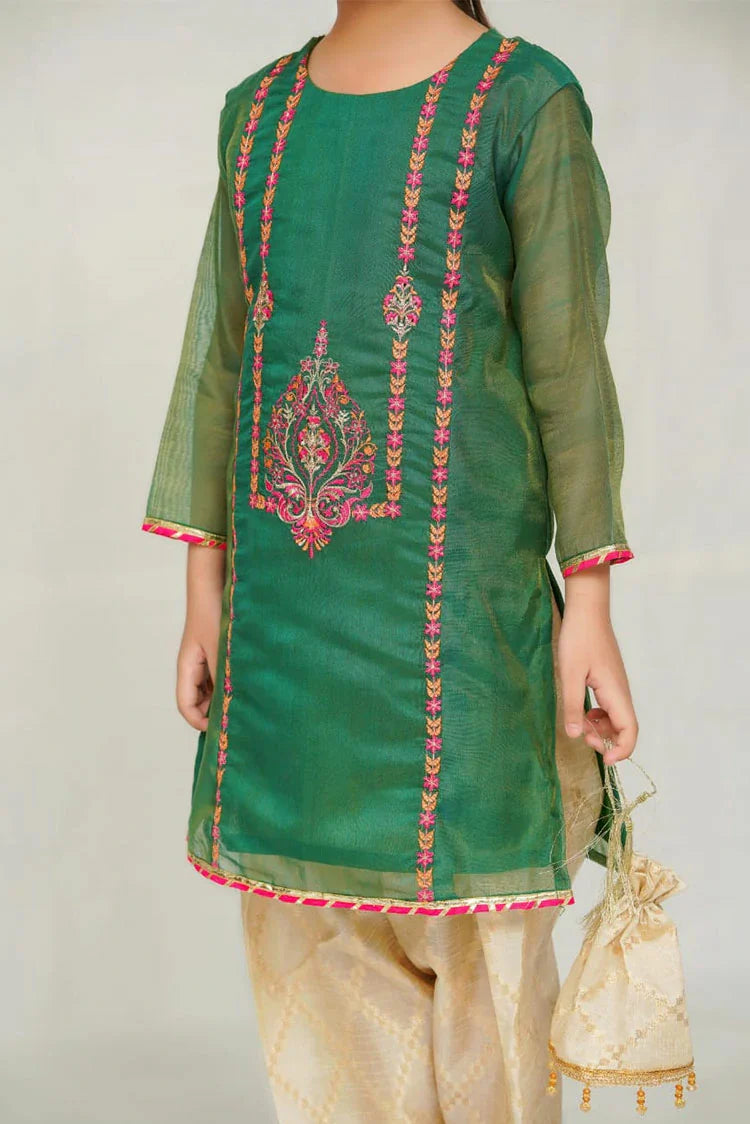 Green shirt with embroidery, golden jamawar shalwar and pouch