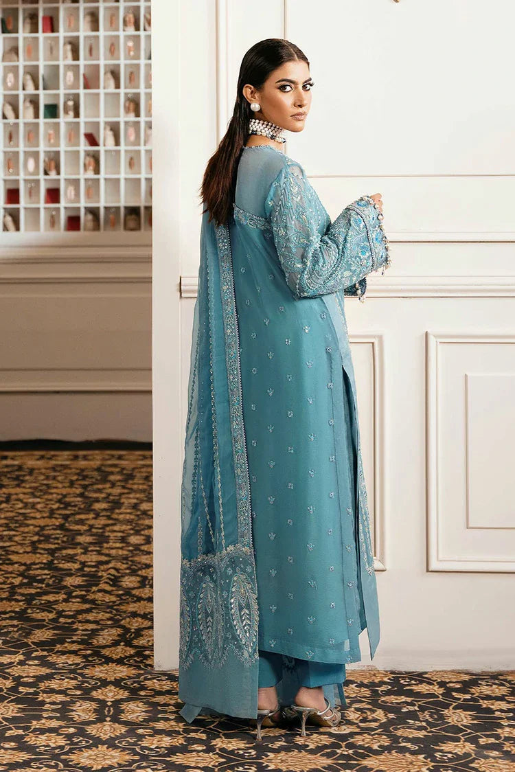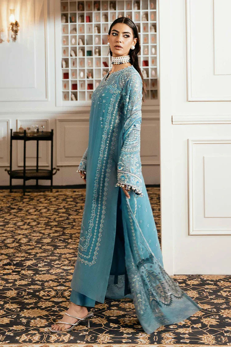 Embrace Serene Sophistication With Dew In Tranquil Aqua. Featuring An Intricately Embroidered Chiffon Shirt And Sleeves, Paired With Raw Silk Trousers And A Delicately Detailed Dupatta. A Look That Flows With Grace And Modern Elegance