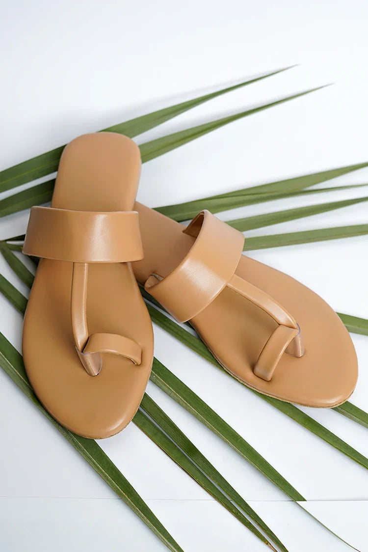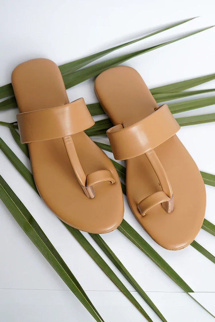 These tan-colored sandals exude effortless summer elegance with their sleek, minimalist design. Crafted from smooth faux leather, they feature a wide upper strap and a distinctive toe loop for added style and secure fit.