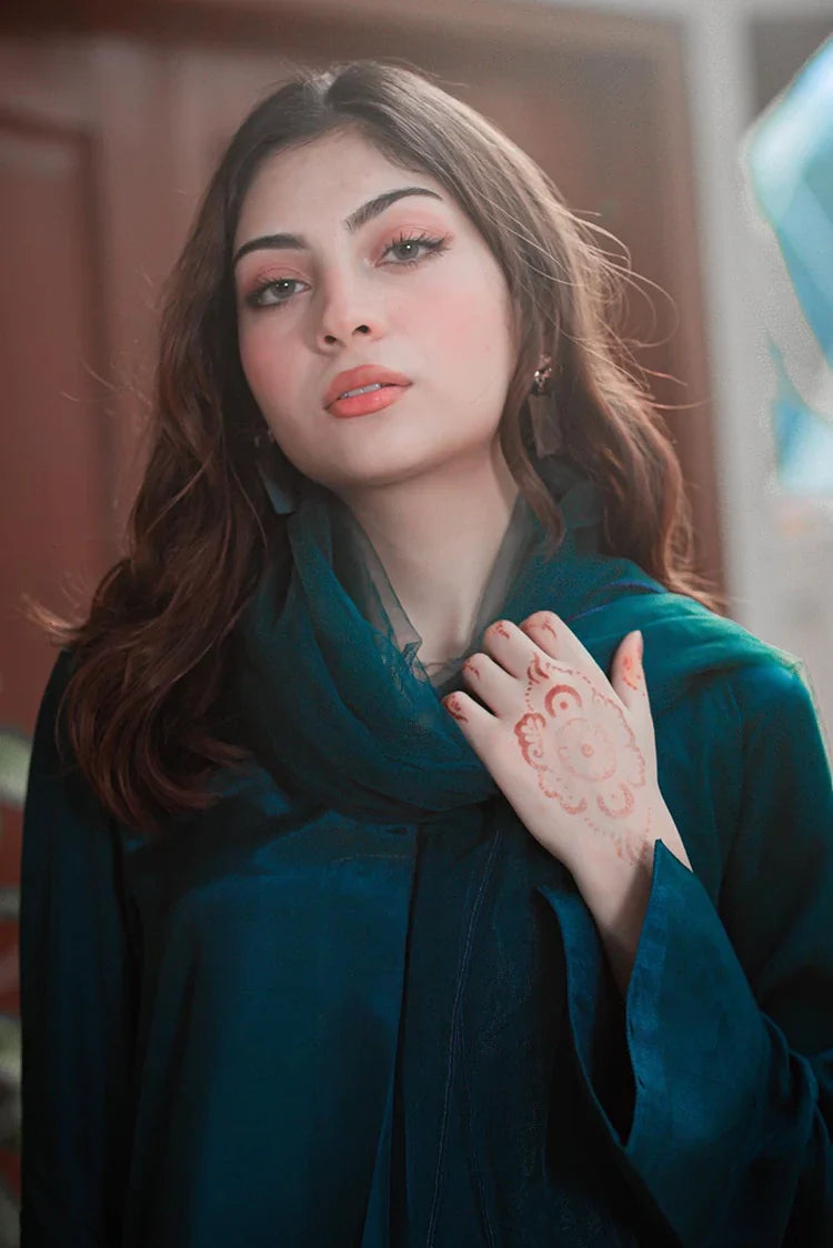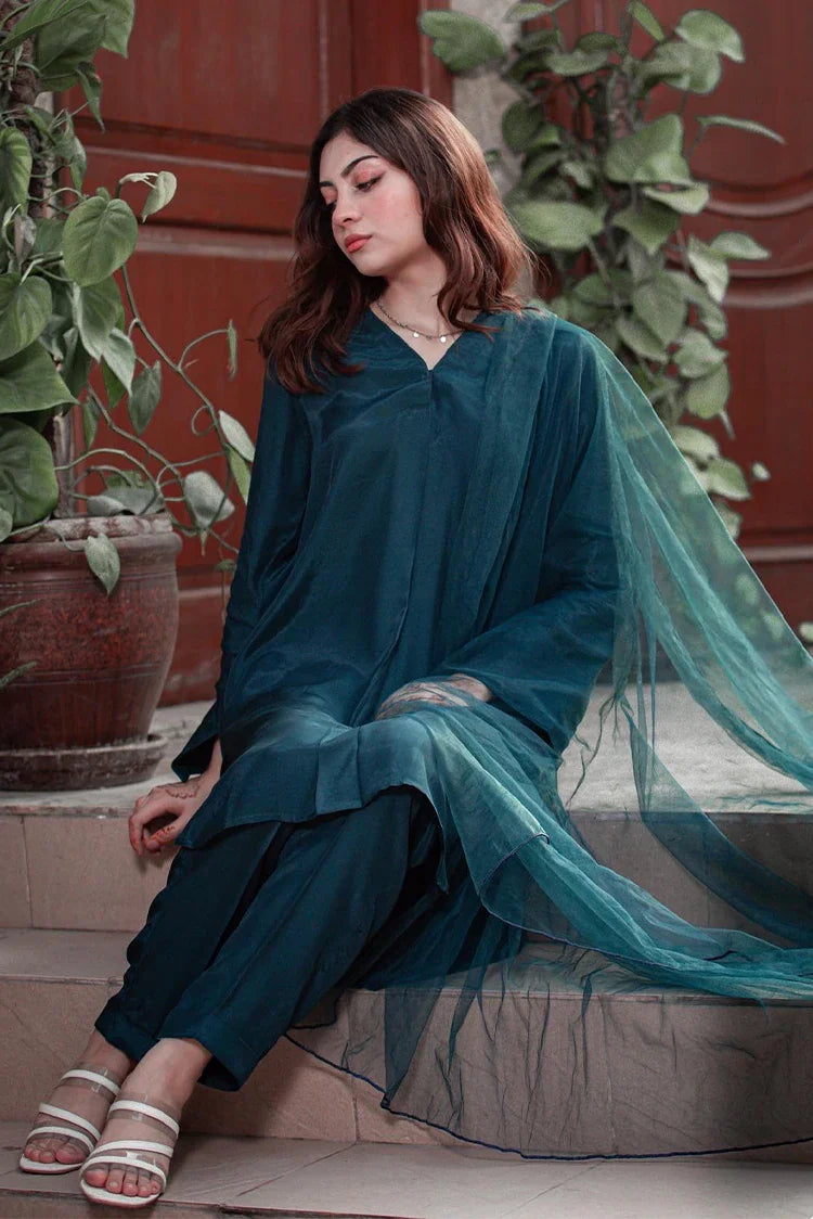 it’s a cotton silk teal blue matching set includes a shirt and pant with matching net dupatta.
