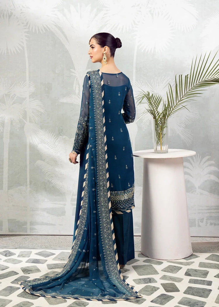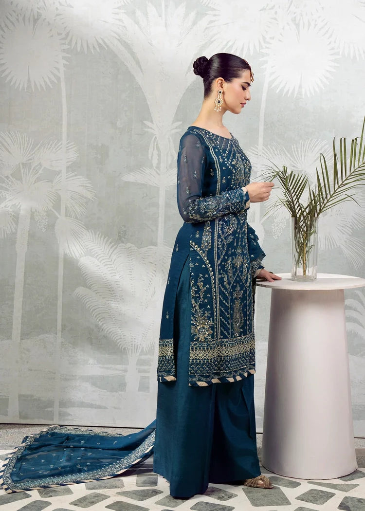 Embroidered & sequined chiffon center panel for front,(1PC) Embroidered & sequined chiffon left side panel for front,(1PC) Embroidered & sequined chiffon right side panel for front(1PC) Embroidered & sequined chiffon sleeves,(2PC) Embroidered & sequined chiffon back(1YARD), Embroidered chiffon dupatta, Embroidered & sequined chiffon border for front, Embroidered & sequined chiffon border for back,(1 YARD) Embroidered & sequined chiffon border for sleeves(1 YARD), Embroidered & sequined raw silk border for dupatta,(2.75) YARD Dyed inner shirt lining,(2.5YARD) Dyed raw silk trouser.(2.75 YARD )