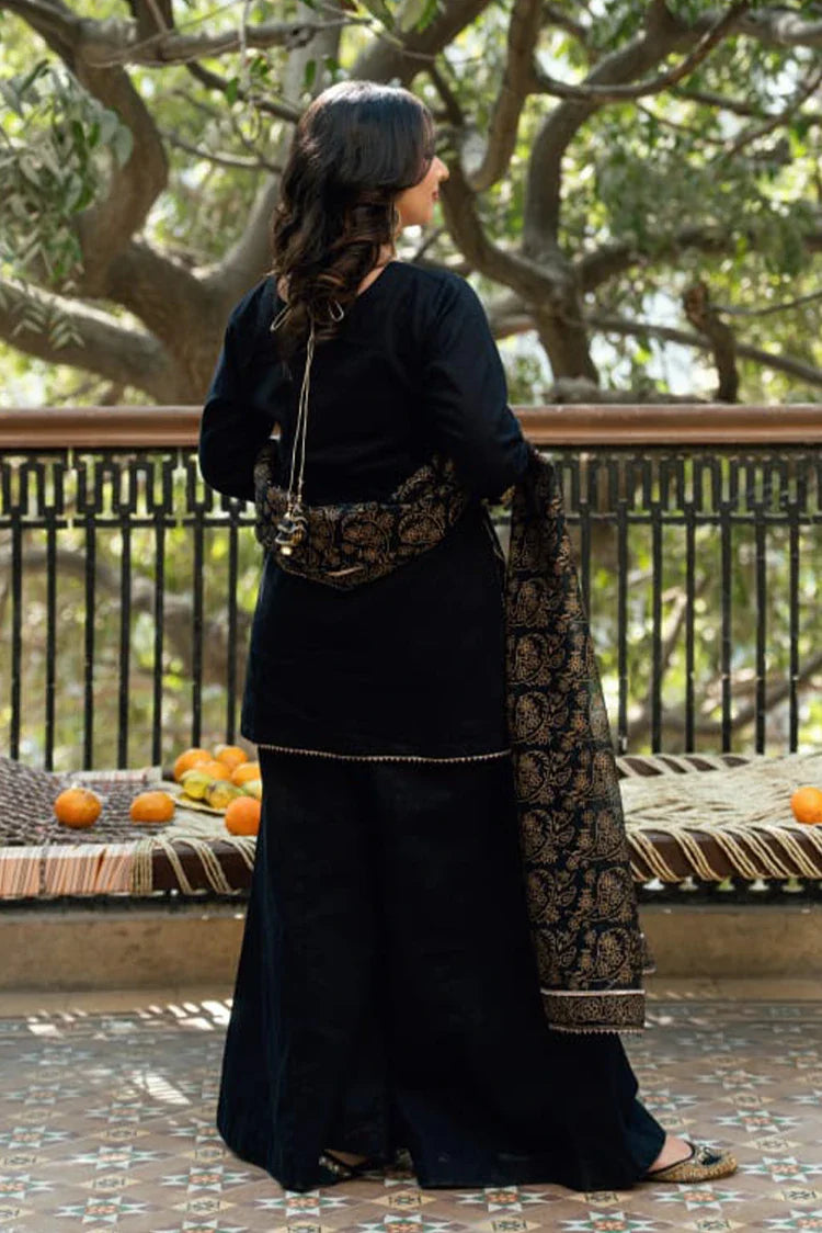 Shirt: Black khaddar embroidered short shirt with rounded square neckline, zari and gota details, dori tassels on back and embroidered sleeves.
