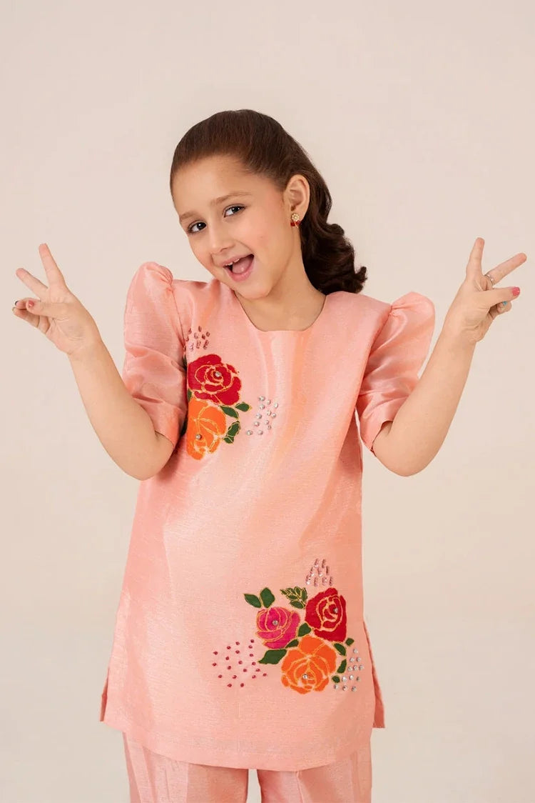 Introducing €œPeach Blossom€� from Emeralds Kids Collection a delightful peach raw silk outfit that brings together delicate craftsmanship and youthful elegance.