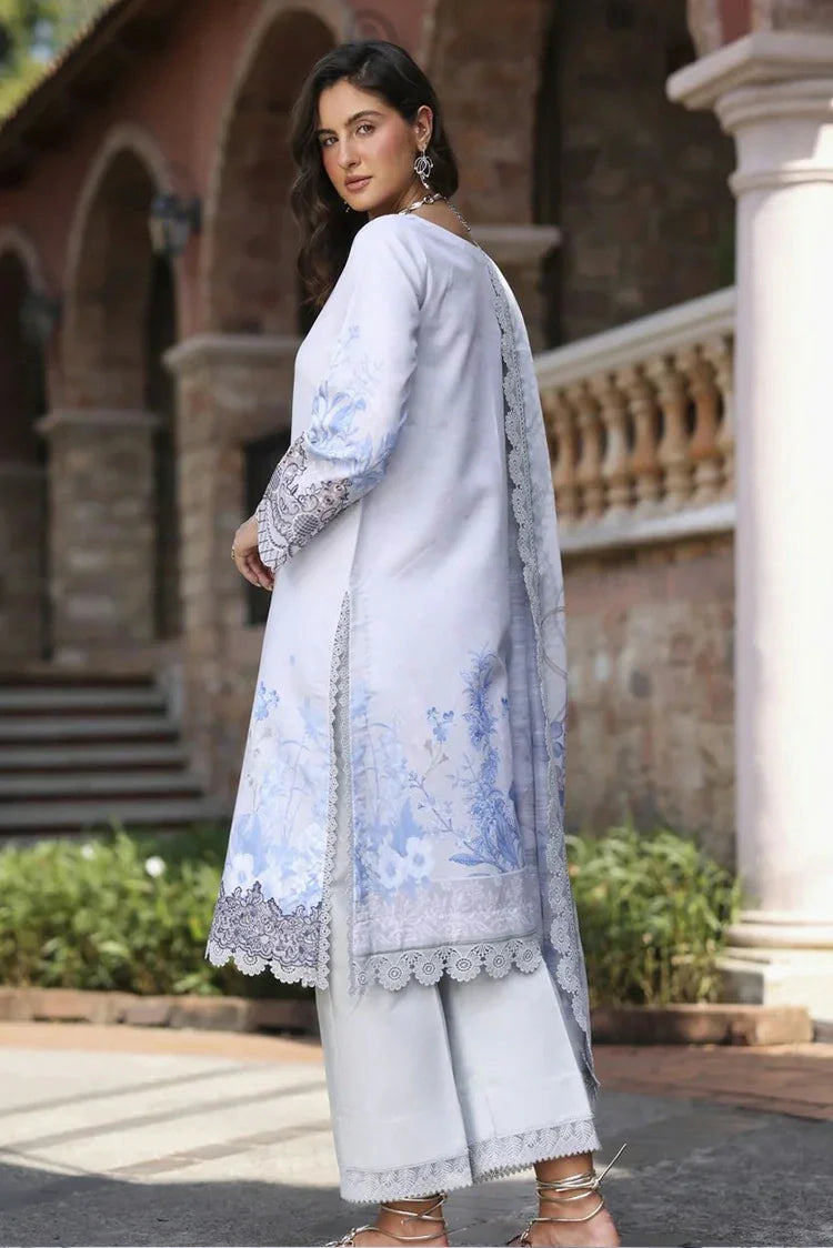 A Celebration Of Feminine Charm, This Lawn Suit Features An Intricate Digital Print Accented With Elegant Embroidery On The Neckline, Front Border, And Sleeves. The Dyed Cotton Trouser Grounds The Look, While The Printed Monak Dupatta Adds A Subtle Sheen And Sophistication To The Ensemble.