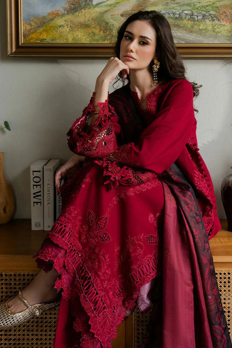 Draped In A Rich Deep Red Hue, This Ensemble Captures Timeless Opulence. The Delicate Cutwork On The Shirt And Sleeves, Paired With A Striking Printed Shawl, Evokes Elegance And Sophistication — A Regal Look Perfect For The Winter Season.