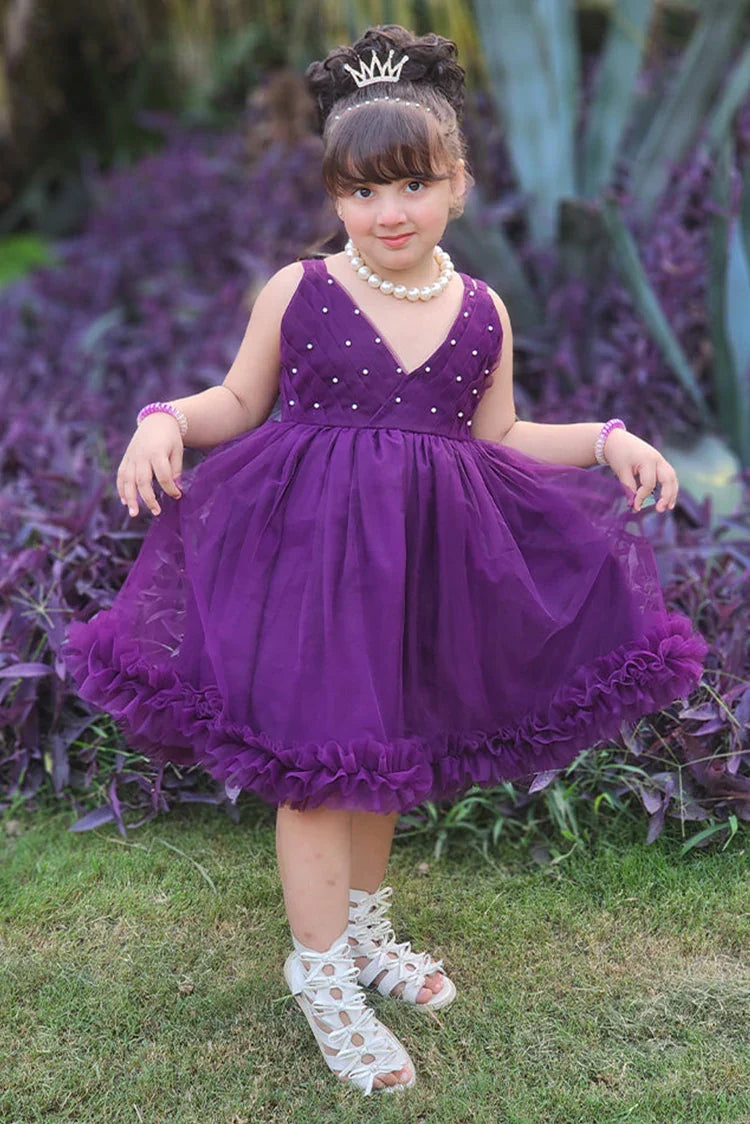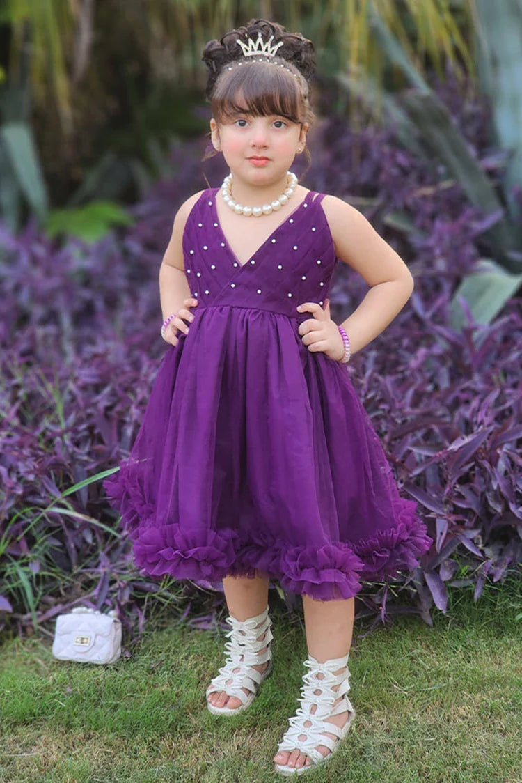 Delicate net frock adorned with white pearls a perfect blend of elegance and charm for little princesses.