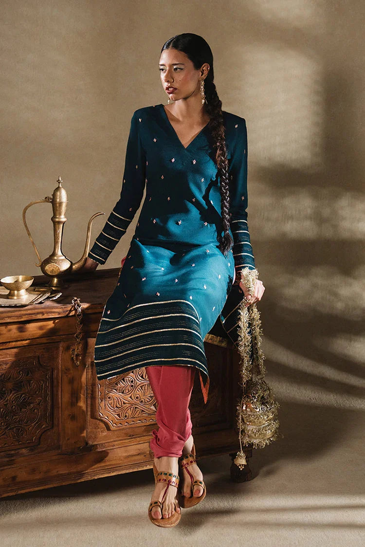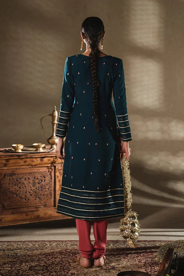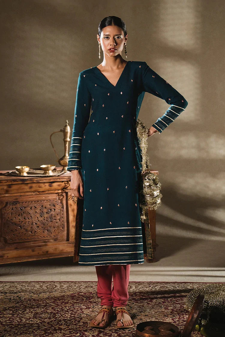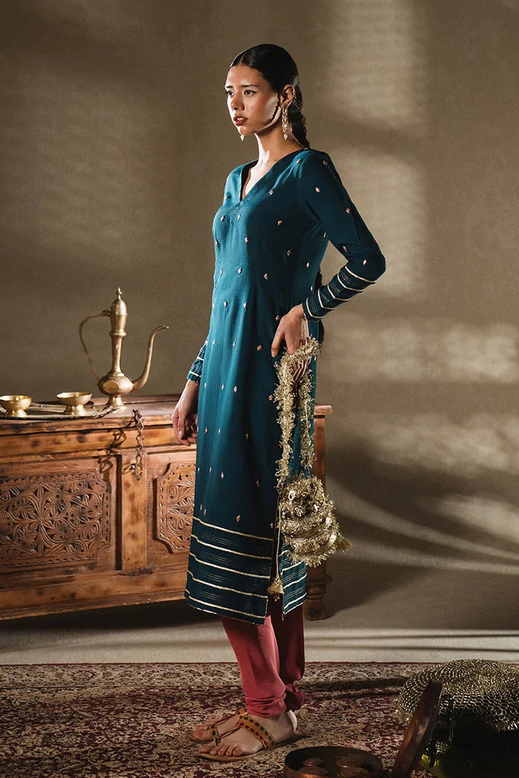 A Shadabi Neelum raw silk kameez, embroidered in a barfi aakaar chann of tamba gota patti and gulabi resham delicate, detailed, and rich with movement. The daman and sleeves are intricately finished with horizontal sunehri tilla taanka, fine pleats, and traditional gota kinari, all tied together by a chaura lappa stitched on the inside. Paired with a contrasting Gul-e-Nari grip chooridar, Rewa brings together rich textures and timeless techniques festive, feminine, and quietly powerful.
