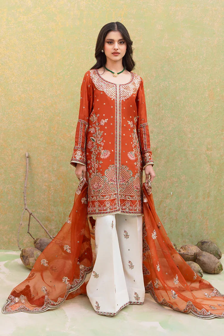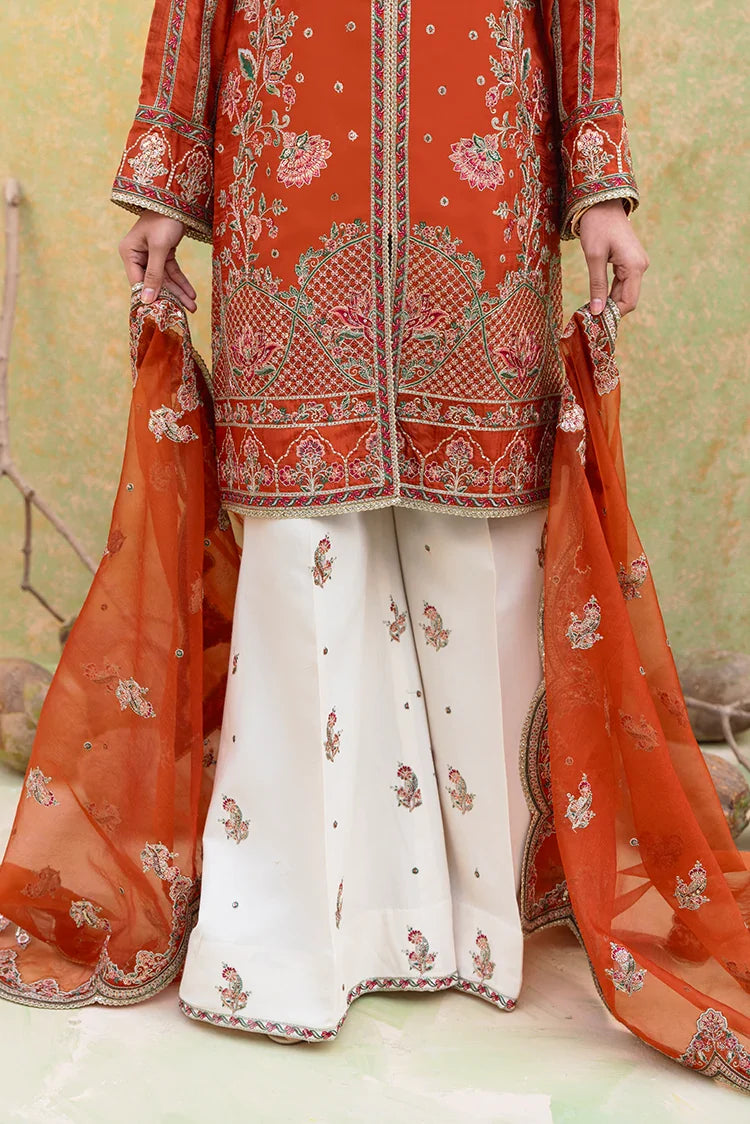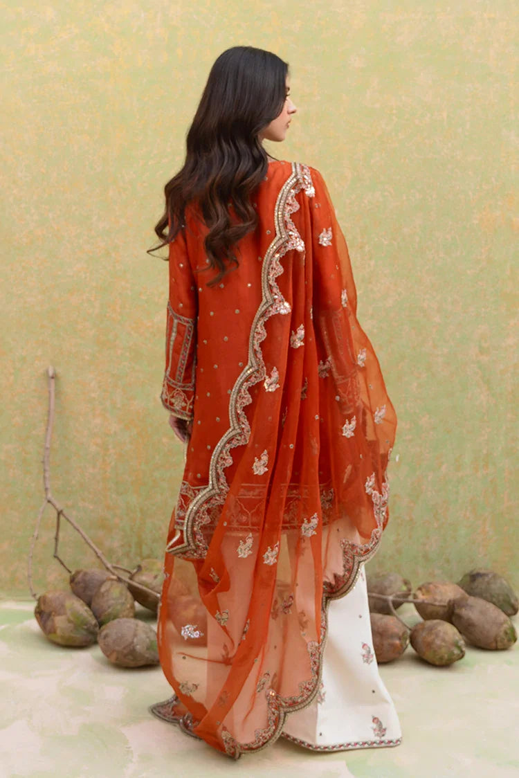 A 4 Piece unique Burnt Orange silhouette, front open shirt, flared embroidered pants, scalloped embroidered dupatta.