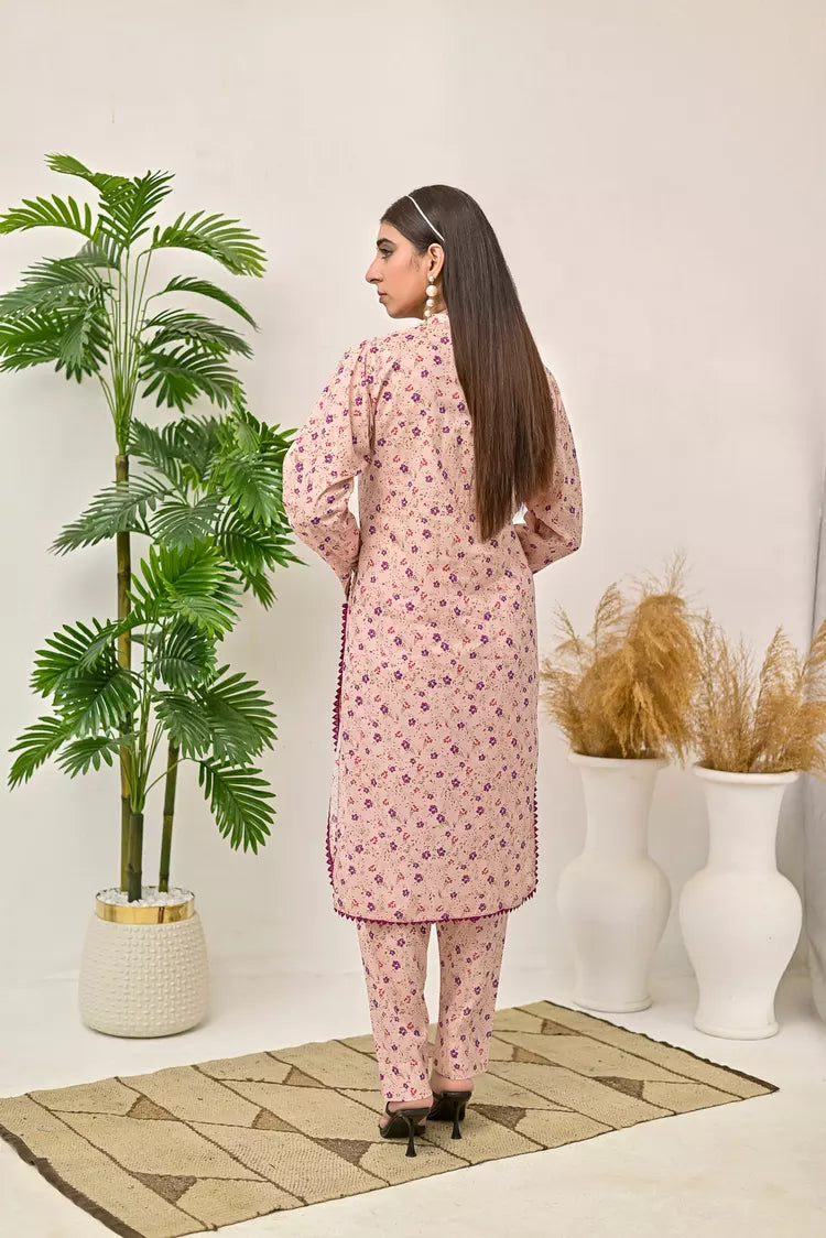 Unveil charm in our Blush Petals two-piece printed cotton set a delicate fusion of comfort and femininity. This outfit features a soft blush pink base adorned with dainty purple floral patterns, finished with button detailing and lace edging on the neckline, sleeves, and hem for a refined touch.