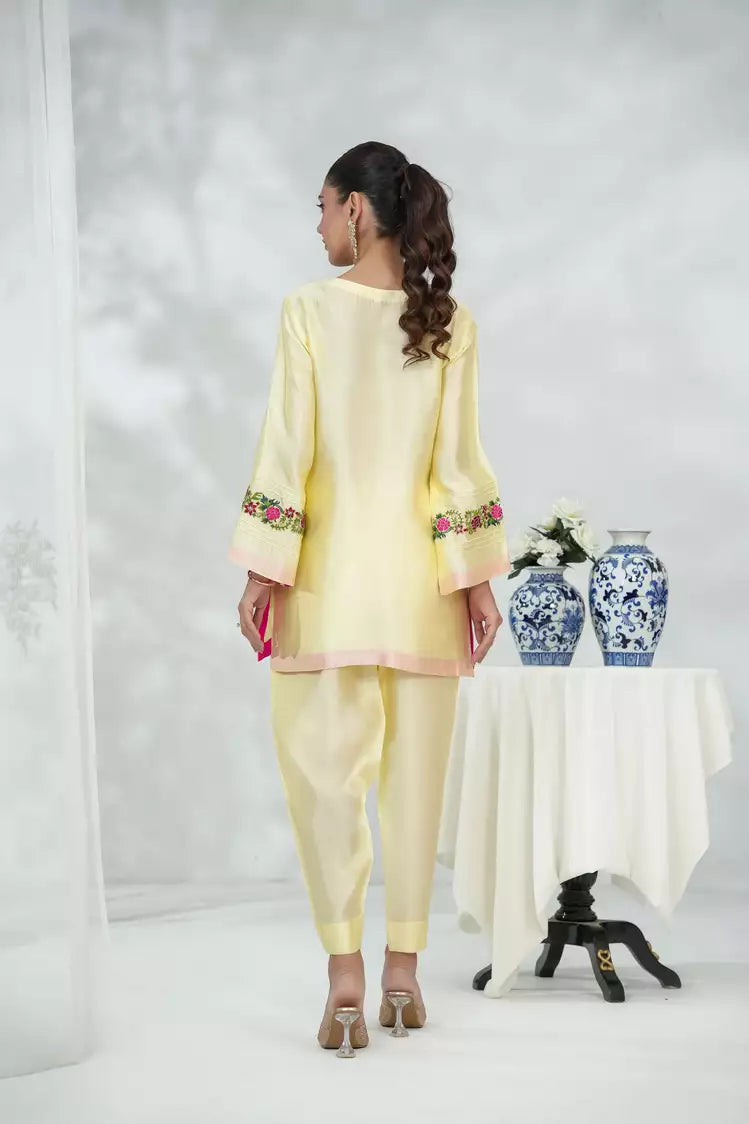 adiate elegance with our Lemon Blossom Silk Ensemble, crafted from premium silk fabric in a soft lemon hue. The shirt features a deep V-neckline adorned with delicate hand-embroidered floral details in vibrant pink and green, paired with flared sleeves finished with contrasting borders. Styled with matching silk trousers, this outfit is a perfect blend of tradition and modern chic€”ideal for festive gatherings, weddings, and evening soirées.