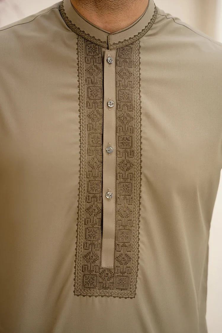 Fabrich - Men's Embroidered Unstitch Kameez Shalwar - Olive Khaki